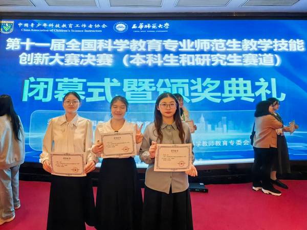 12月1日至3日,由中国青少年科技教育工作者协会主办,西华师范大学承办的第十一届全国科学教育专业师范生教学技能创新大赛决赛(本科和研究生赛道)在西华师范大学华凤校区举行。beat365英国官方网站胡蓉、姜心懿、李卓群等3名选手在决赛中敢打敢拼,最终取得了3项三等奖的成绩。
