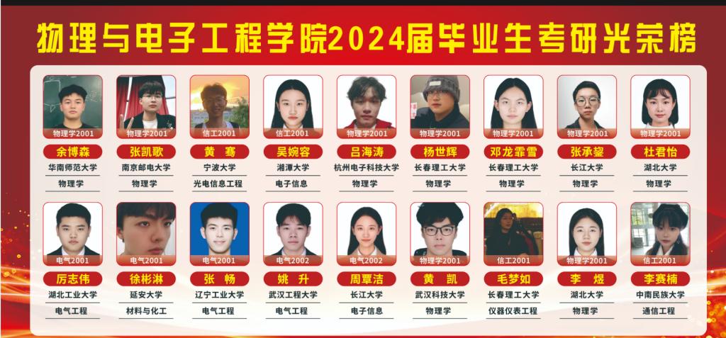 考研捷报频传,我院学子再展风采。随着2024年全国硕士研究生招生录取工作的圆满结束,学院2024届毕业生共有18人成功被录取,另有1人成功被国外高校录取。据统计,我院2024届共有184名毕业生,报考54人,录取率高达10.6%,报录率为33.3%,录取高校不乏华南师范大学、南京邮电大学、宁波大学、湘潭大学等“双一流”高校。其中,在录取学生中,物理学专业毕业生占比47.3%,也彰显了学院物理学专业人才培养成效显著。