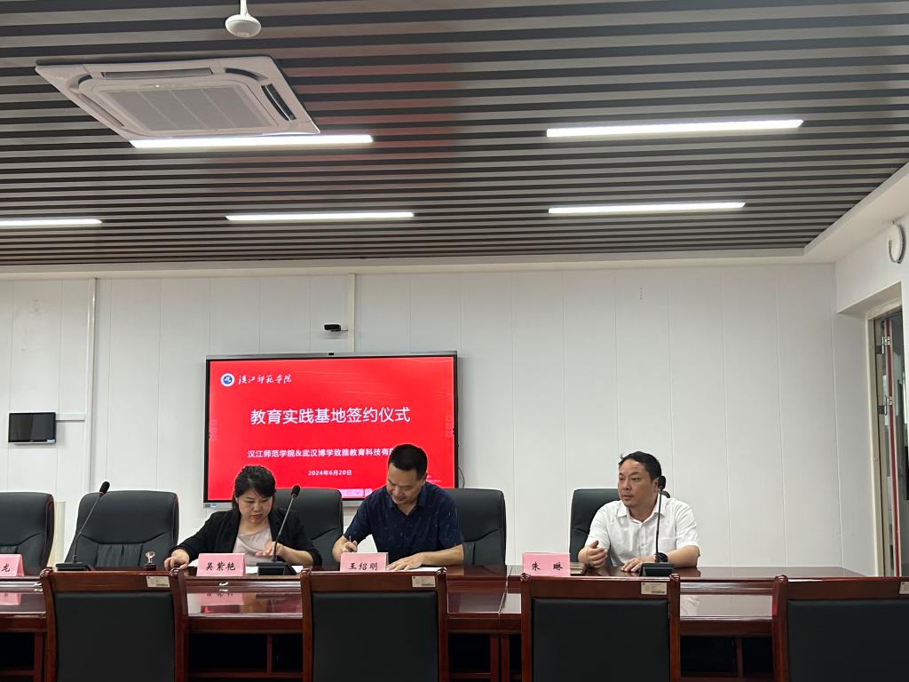 为积极推进我院师范生教育实习工作,建设高质量的教育实践教学基地,6月22日下午,beat365英国官方网站与武汉博学致雅教育科技有限公司在崇文楼B809隆重举行了共建教育实践基地的签约授牌仪式。beat365英国官方网站教务处副处长朱琳、beat365英国官方网站院长王绍明、副院长欧修龙、副书记戴俊、21级辅导员李朦及21级全体师范生参加此次会议。
