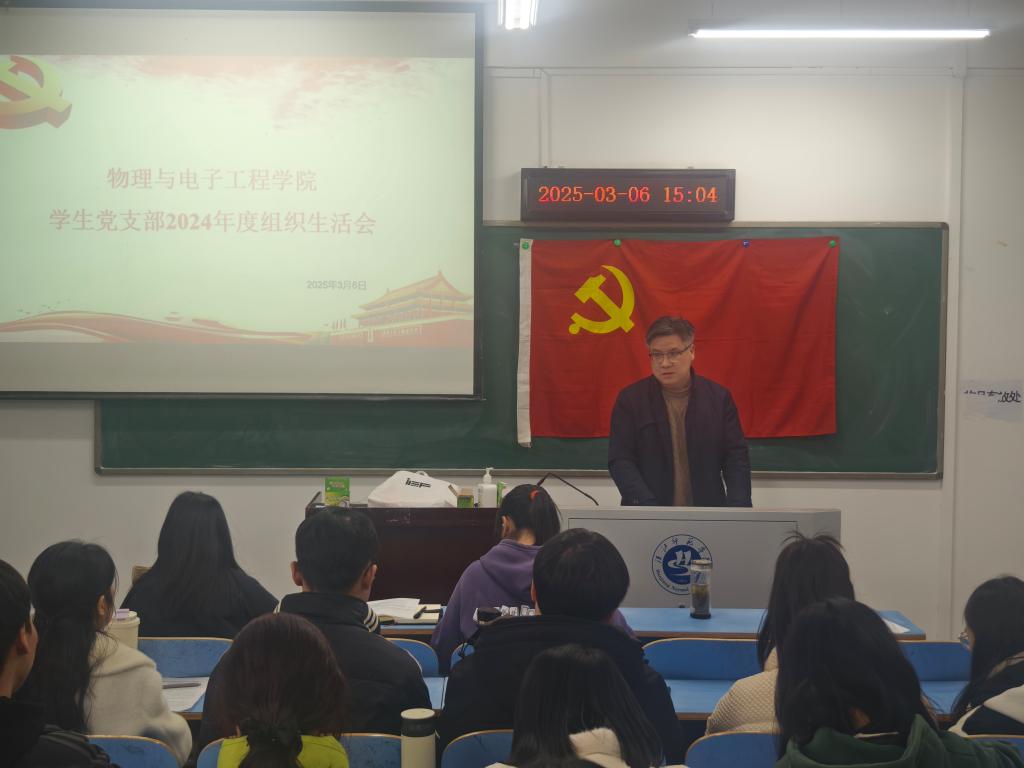 最后,唐传球对本次组织生活会进行了点评,对支部2025年工作和全体党员提出了三点要求,一是要加强政治理论学习,筑牢思想根基,特别是关于教育强国建设、全国教育大会精神,做到学深悟透、融会贯通;二是要扎实进行整改,结合自身查摆出来的问题和会上同志们相互批评的意见,列出整改清单,确保此次生活会取得实效;三是要强化担当担当作为,结合学院专业特色,充分发挥党支部在育人方面的堡垒作用和党员在学风引领上的先锋模范作用。纪检委员范志鹏代表支部作出表态发言。