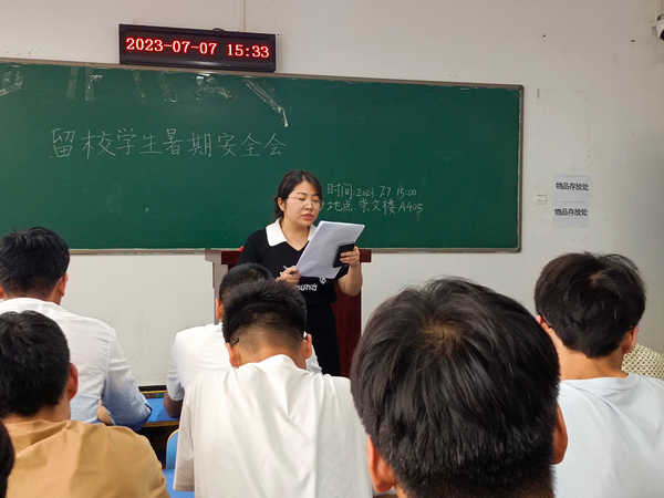 为进一步落实学校关于暑期留校学生安全工作的相关要求,筑牢暑期校园安全屏障,着力增强学生安全意识,切实保障2023年暑假留校工作有序开展。7月7日下午,beat365英国官方网站在崇文楼A405教室召开2023年暑期留校学生安全教育大会。院分党委书记唐传球、全体辅导员老师、竞赛指导老师及全体暑期留校学生参加了大会。