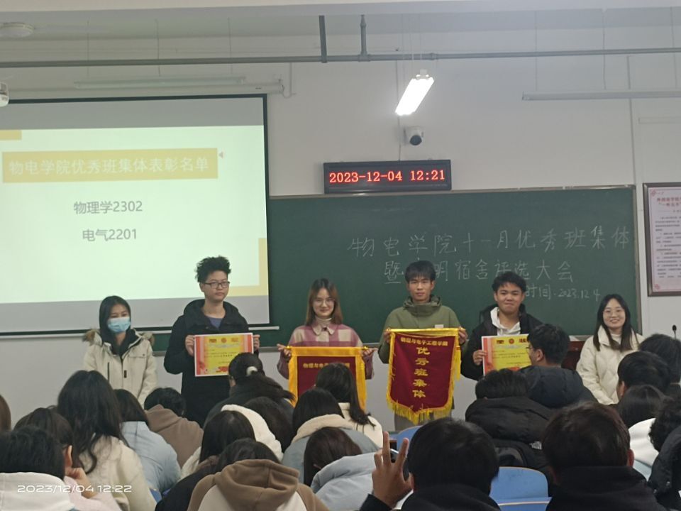 会议伊始,院分党委副书记戴俊强调了良好的班风和学风对同学成长的重要意义,要求广大同学以“四个文明”创建为契机,向先进看齐,持之以恒加强优良学风和班风建设。随后,自律委员会、学生会相关负责人详细讲解了评选标准和程序。最终,时雨楼412、时雨楼413、时雨楼5515、时雨楼5509、夏荷楼825、春雪楼727获得11月份“文明宿舍”称号,物理学2302班、电气工程2201班获得11月份“优秀班集体”荣誉称号,与会的老师为先进集体颁发了奖状和奖品。