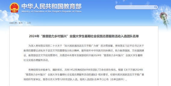 近日,教育部发布《2024年“推普助力乡村振兴”全国大学生暑期社会实践志愿服务活动入选团队名单》,我院“藏区推普实践小分队”成功入选。
