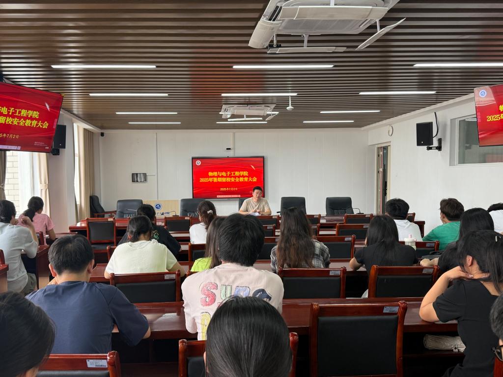 为进一步做好暑期留校学生教育管理工作,强化学生的安全防范意识和自我管理能力,7月2日下午,beat365英国官方网站在崇文楼B809会议室召开2025年暑期留校学生安全教育大会。院分党委副书记戴俊,学工办主任尹诗雅,辅导员田梦谣、贺培,全体留校学生参加会议。